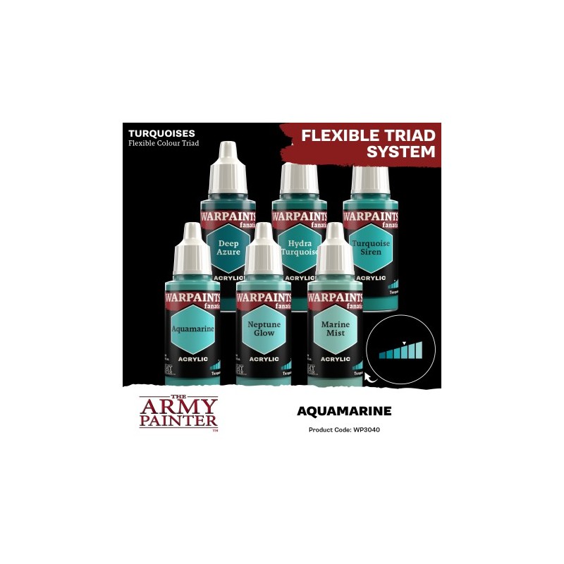 J'en profite !The Warpaints Fanatic : Aquamarine est un bleu verdâtre éclatant, idéal comme teinte de base ou pour mettre en valeur les nuances turquoise. C’est l’une des deux teintes intermédiaires de la triade flexible des couleurs « Turquoises », et son nom pratique est « Bleu verdâtre brillant ».