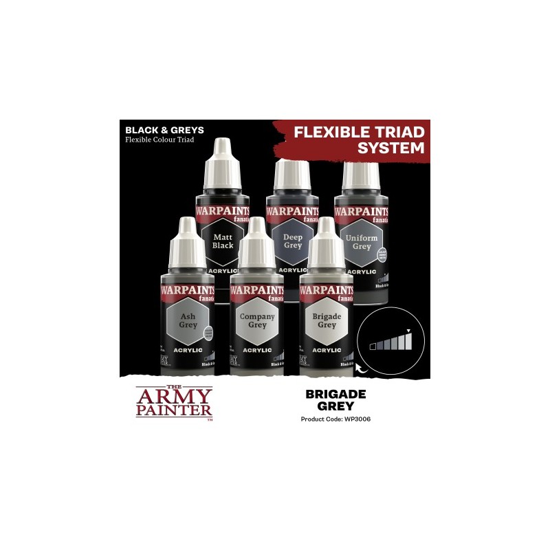 J'en profite !Le Warpaints Fanatic : Brigade Grey est une peinture gris très clair, idéale comme couleur de surbrillance naturelle pour les gris plus foncés. C'est la teinte la plus claire de la triade "Black & Greys" Flexible Colour, et son nom pratique est "Gris Très Clair".