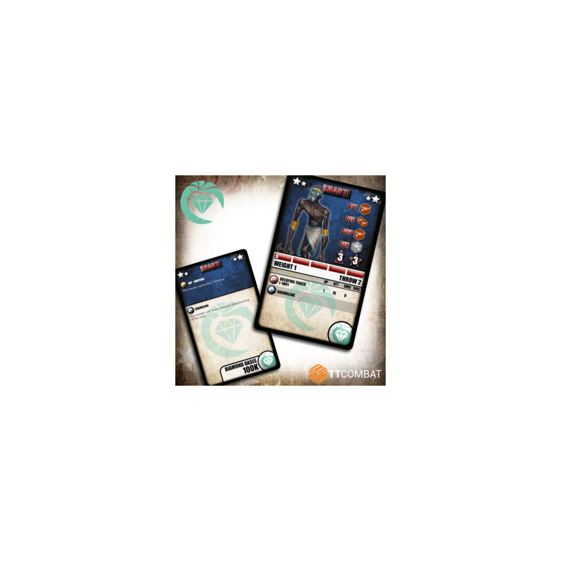 Les POIDS 1 de l’équipe sont représentés par deux Shabti, des cadavres réanimés. Leurs statistiques sont identiques, reflétant leur nature mécanique et dépourvue d’autonomie. La bonne nouvelle ? Les Shabti sont les catcheurs les moins chers du jeu, coûtant seulement 100K chacun. La mauvaise ? Ils sont lents, limités à un coup réduisant la MP de -1, et quasiment inutiles seuls.