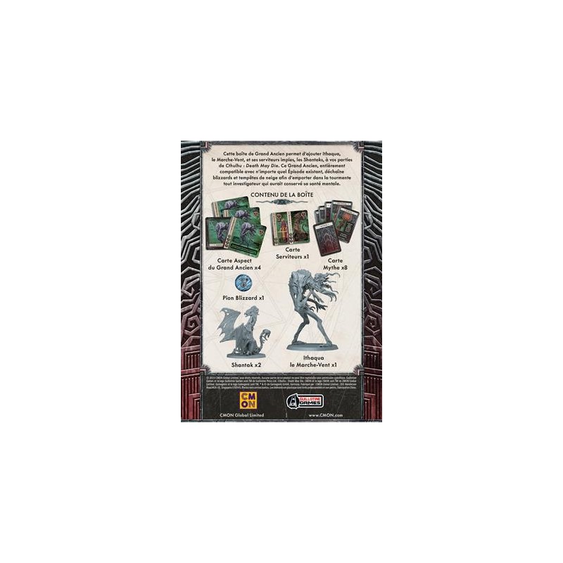 J'en profite !Cette extension introduit Ithaqua, le Marche-Vent, et ses serviteurs impies, les Shantaks, dans vos parties de Cthulhu: Death May Die. Entièrement compatible avec tous les épisodes existants, ce Grand Ancien invoque blizzards et tempêtes de neige, plongeant les investigateurs dans une tourmente glaciale qui menace leur santé mentale.