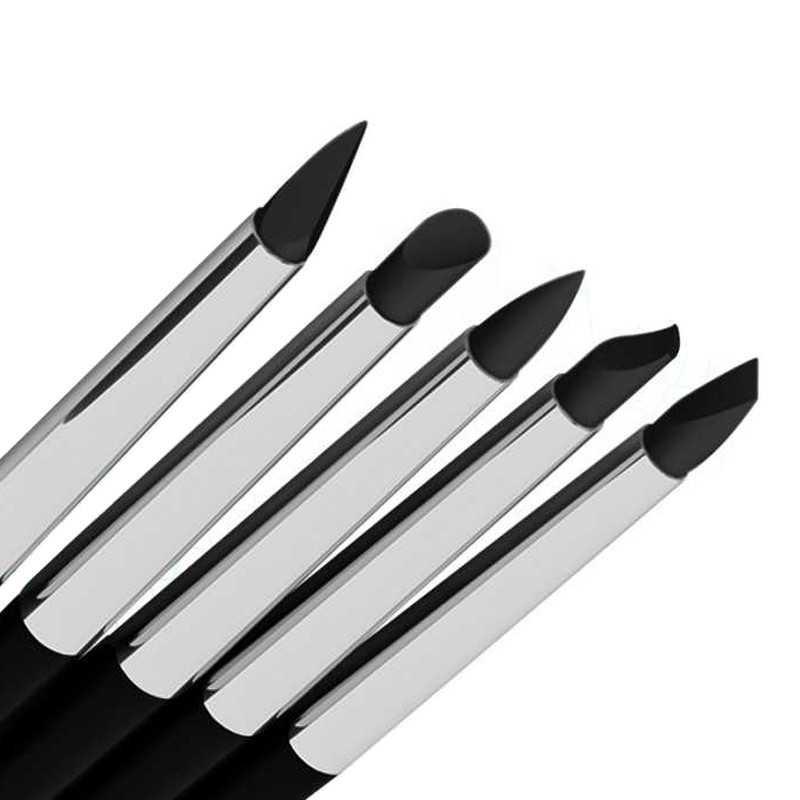 Ces pinceaux noirs de type FERME sont les plus rigides de leur catégorie, tout en restant suffisamment souples pour travailler le mastic. Chaque pinceau est doté d’une pointe en silicone aux formes variées, adaptées à différents usages.