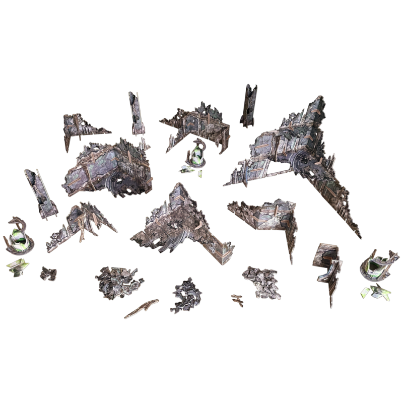 Le terrain est livré sous forme de cartes de haute qualité et haute densité, imprimées en couleurs sur les deux faces, et prêt à être assemblé. Aucun travail de peinture n'est nécessaire ! L'assemblage du terrain est requis, et certaines petites pièces devront être collées. Ce terrain est identique aux ruines extraterrestres incluses dans le jeu de terrain Trader Encampment.