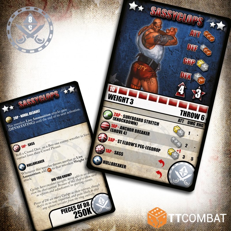 J'en profite !La première équipe issue du casino flottant est cette bande hétéroclite de catcheurs. Faisant une entrée fracassante avec toute son arrogance, voici Sassyclops. Ce colosse de Poids 3 ne manquera pas de projeter ses coéquipiers à travers le ring, infligeant un maximum de dégâts grâce à son Assaut Naval.