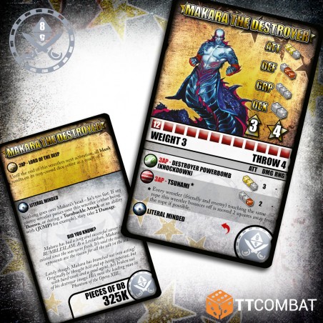 J'en profite !Makara est une véritable force de la nature. Avec deux médailles d'or et une d'argent en ATT, il s’impose comme un redoutable bagarreur. Ne sous-estimez pas une seconde sa capacité de prise : le Destroyer Powerbomb inflige 3 points de dégâts de base et provoque un renversement, faisant de cette attaque une prise redoutable que beaucoup envieraient. Quant à Tsunami, il déferle à travers les cordes, repoussant tout sur son passage.