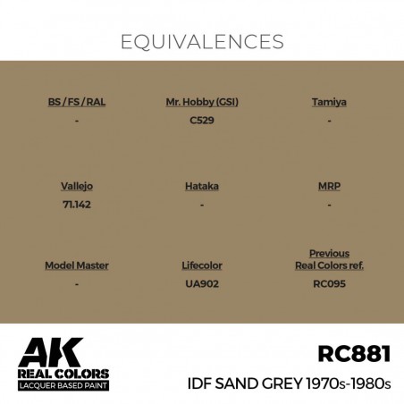 Cette teinte correspond à la couleur standard des véhicules et équipements militaires de l’IDF après la guerre du Yom Kippour en 1973. Elle reflète le ton plus sombre adopté pour les forces terrestres positionnées sur les frontières nord d’Israël, afin de mieux se fondre dans les teintes grisâtres du terrain.