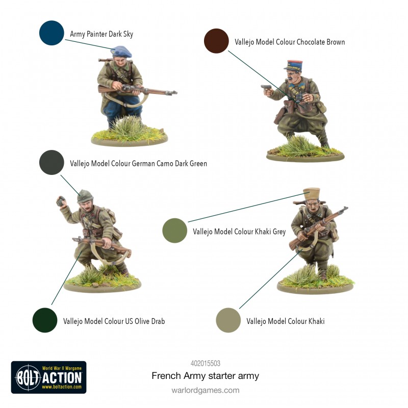 J'en profite !Cette armée de démarrage Bolt Action constitue une base solide pour votre nouvelle force de l'armée française. Les figurines d'infanterie en plastique, hautement détaillées et multi-positions, peuvent être assemblées et peintes en tant qu’infanterie régulière, troupes de forteresse, chasseurs à pied, sapeurs ou troupes coloniales (algériennes, marocaines et tunisiennes). Cette diversité vous permet de constituer une armée variée et colorée, capable de faire face à la fulgurante Blitzkrieg allemande.