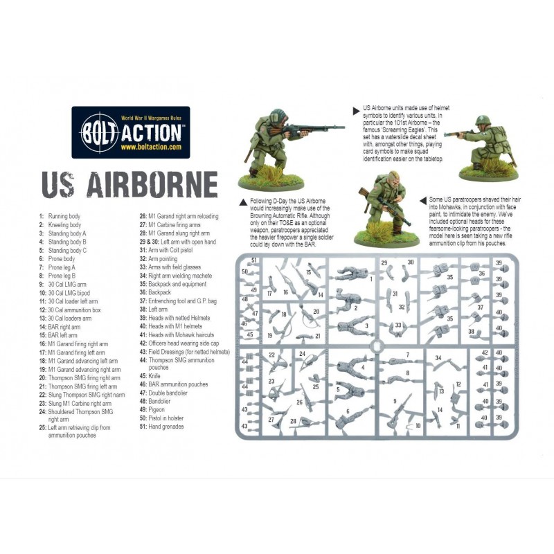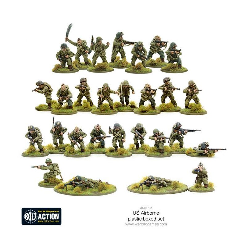 J'en profite !Ce fantastique peloton de parachutistes américains de la fin de la Seconde Guerre mondiale contient suffisamment de composants en plastique pour assembler 30 figurines de l'US Airborne en uniforme M-1943, avec de nombreuses options permettant de varier les configurations d’armes et de commandement.