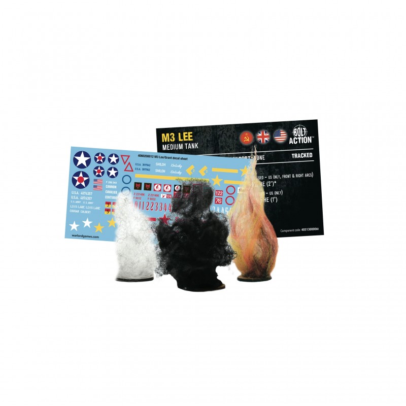 La boîte contient une maquette en plastique du char moyen M3 Lee, une planche de décalcomanies, une carte de statistiques pour Bolt Action ainsi que des marqueurs de dégâts de véhicule.