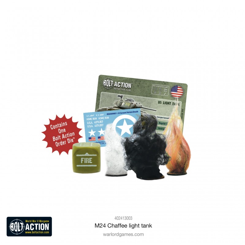La boîte contient un char léger M24 Chaffee en résine et métal, des dés de commande, des décalcomanies et des accessoires de jeu.