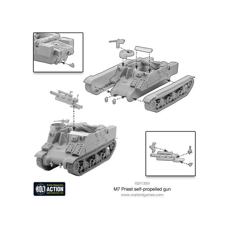 La boîte contient un M7 Priest automoteur en résine et métal, des dés de commande, des décalcomanies et des accessoires de jeu.
