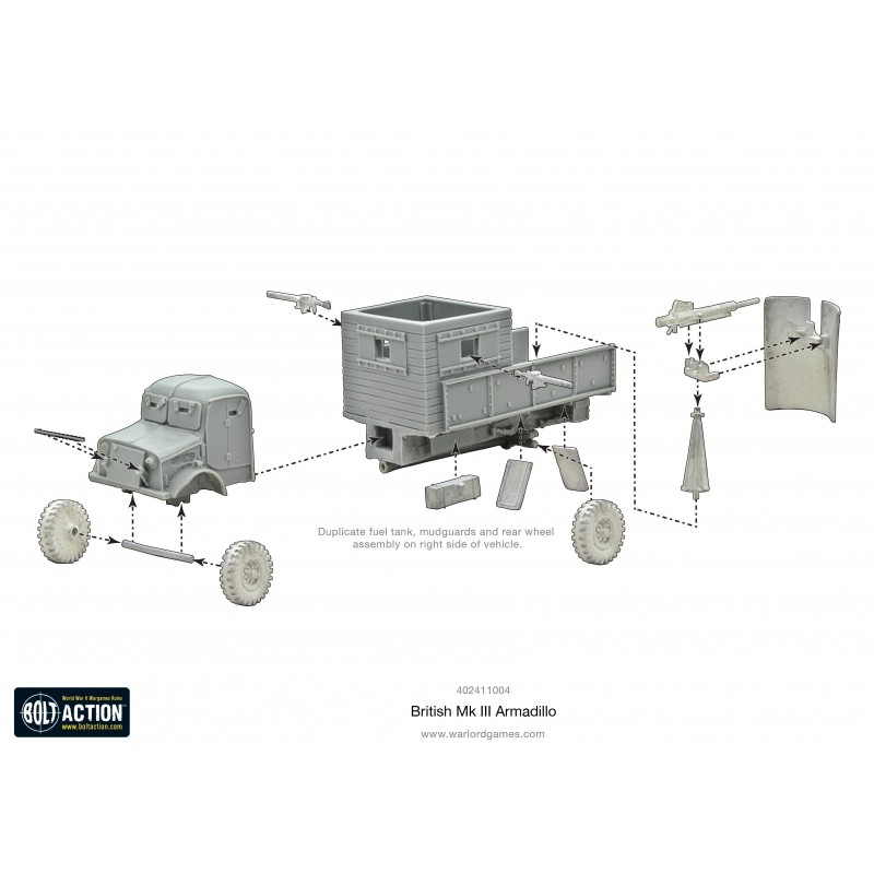 Ce kit contient un canon automoteur Mk. III Armadillo en résine et métal, une carte de statistiques Bolt Action, des marqueurs de dégâts, une planche de décalcomanies couleur et un dé d’ordre Bolt Action. Modèle fourni non assemblé et non peint.