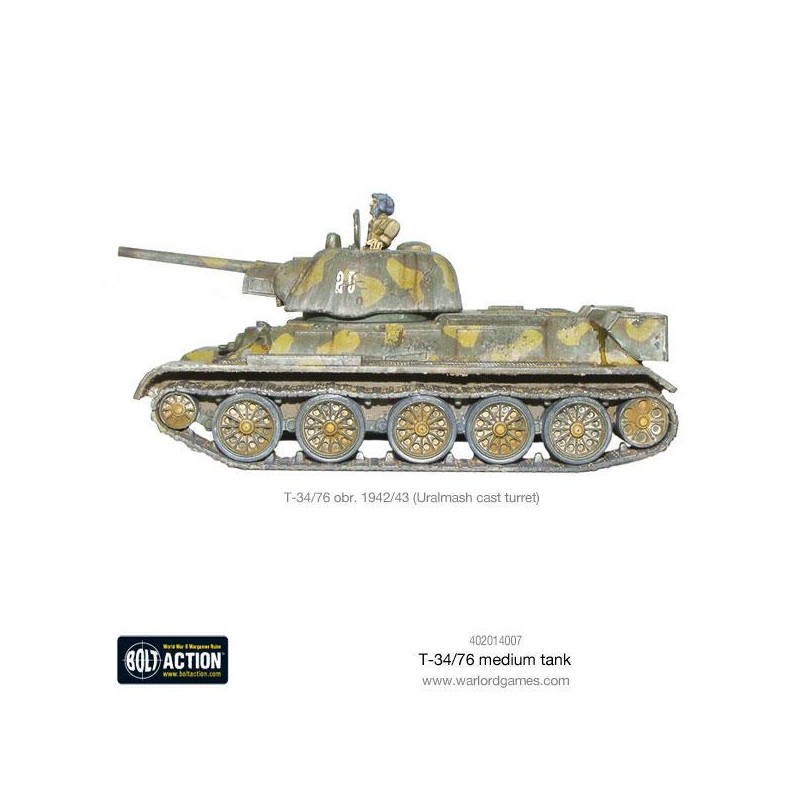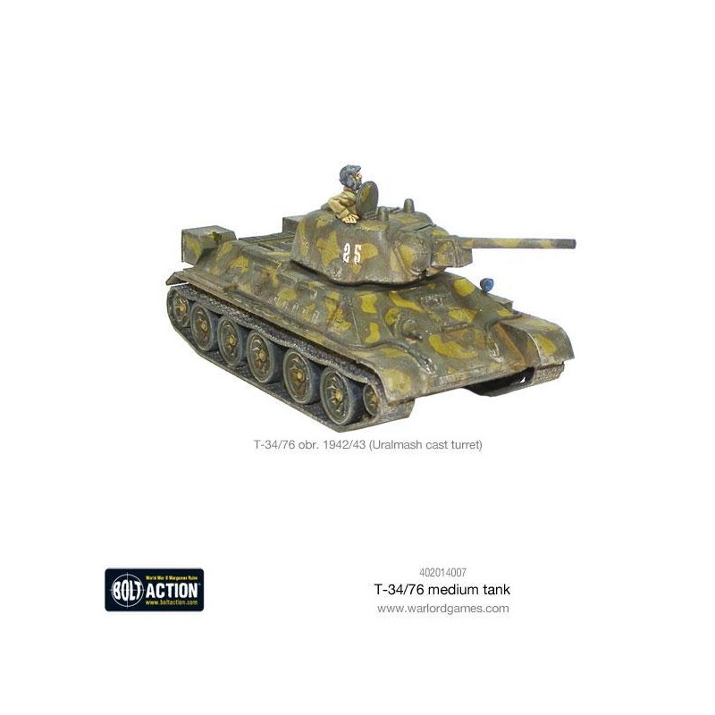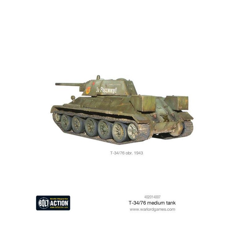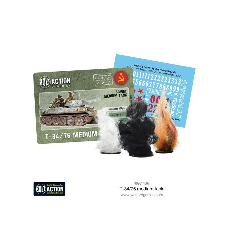 Ce kit en plastique vous permet d’assembler un T-34/76 dans l'une des trois variantes distinctes : modèle 1941, 1942 ou 1943, chacune avec sa propre tourelle caractéristique. La boîte contient un char à monter, une feuille d’instructions, une planche de décalcomanies, une carte de statistiques Bolt Action, ainsi que des marqueurs de dégâts pour les parties. Ce véhicule est également compatible avec le jeu Achtung Panzer!, centré sur les affrontements rapprochés entre blindés. Une pièce incontournable pour tout joueur ou collectionneur passionné par la Seconde Guerre mondiale.