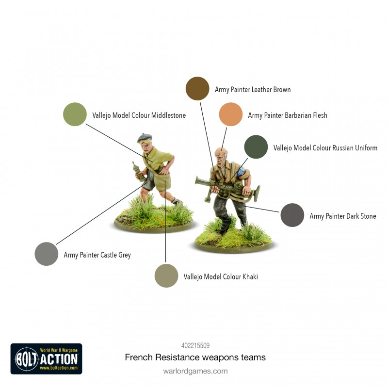 Quant aux armes antichars, elles étaient rares chez les forces de la Résistance. Toutefois, les véhicules utilisés à l’arrière par les forces d’occupation étaient souvent légers et peu protégés. Des armes comme le PIAT, parfois parachutées par les Alliés, permettaient aux partisans d’avoir une chance contre ces blindés. Ce set contient trois figurines en résine Warlord Resin Plus™ : une équipe de mortier léger, une équipe de sniper et une équipe de PIAT, chacune composée de deux membres. Trois dés d’ordre Bolt Action sont également inclus. Modèles fournis non assemblés et non peints.
