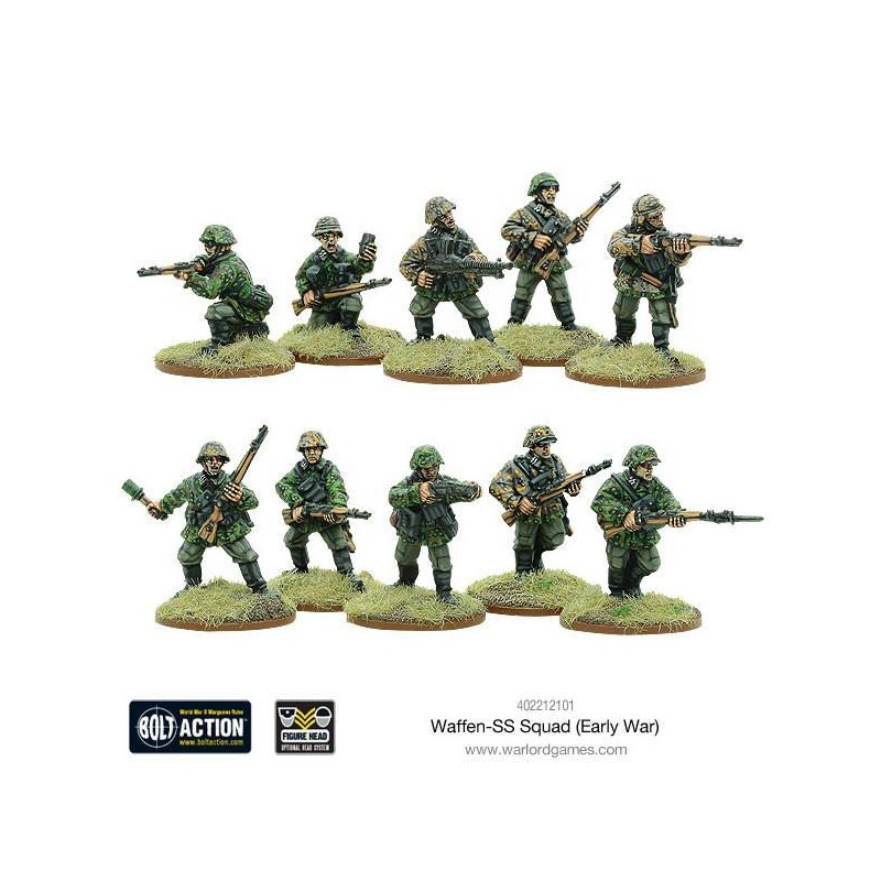 Cette boîte contient une section complète de 10 hommes en métal : un sous-officier armé d’un pistolet mitrailleur, une équipe de soutien avec mitrailleuse légère (LMG) et sept fantassins avec fusils. L’équipement typique comprend les célèbres tenues camouflées SS – smocks et couvre-casques – et les escouades s’articulent souvent autour de la puissance de feu de la mitrailleuse légère CZ-26 d’origine tchèque, prisée pour sa fiabilité.