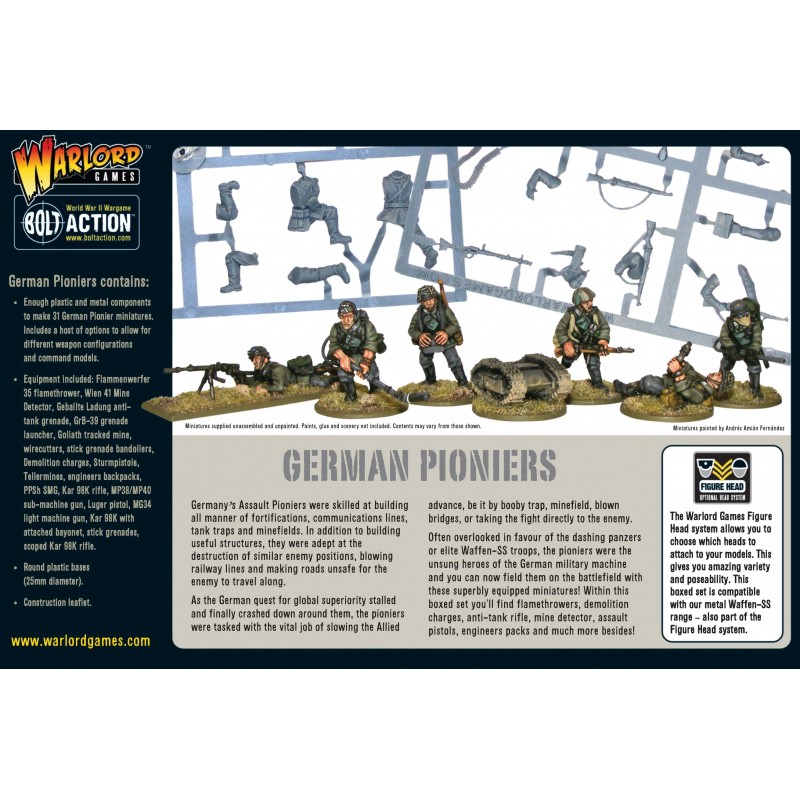 Ce set propose 31 figurines en plastique et métal ultra-équipées, parfaites pour représenter des unités de génie allemand dans Bolt Action. Vous y trouverez lance-flammes, charges de démolition, détecteurs de mines, Goliath télécommandé, Sturmpistole, grenades, fusils, mitrailleuses et plus encore. Une infinité de configurations sont possibles, vous permettant de personnaliser chaque figurine selon votre style de jeu. Un excellent choix pour les joueurs souhaitant ajouter du réalisme, de la tactique et une vraie identité historique à leur armée allemande !