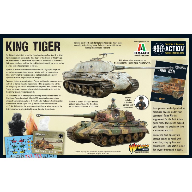 Cette boîte contient un char Tiger II à l’échelle 1/56 en plastique dur, avec la possibilité de monter la tourelle Henschel ou Porsche. Elle inclut aussi un commandant allemand détaillé, un guide complet d’assemblage et de peinture en couleur, des décalcomanies réalistes ainsi qu’un set de marqueurs de dégâts pour vos parties. Le modèle est livré non assemblé et non peint, offrant ainsi une expérience de modélisme complète.
