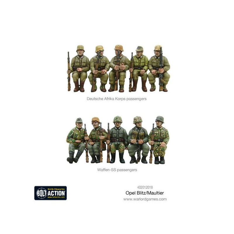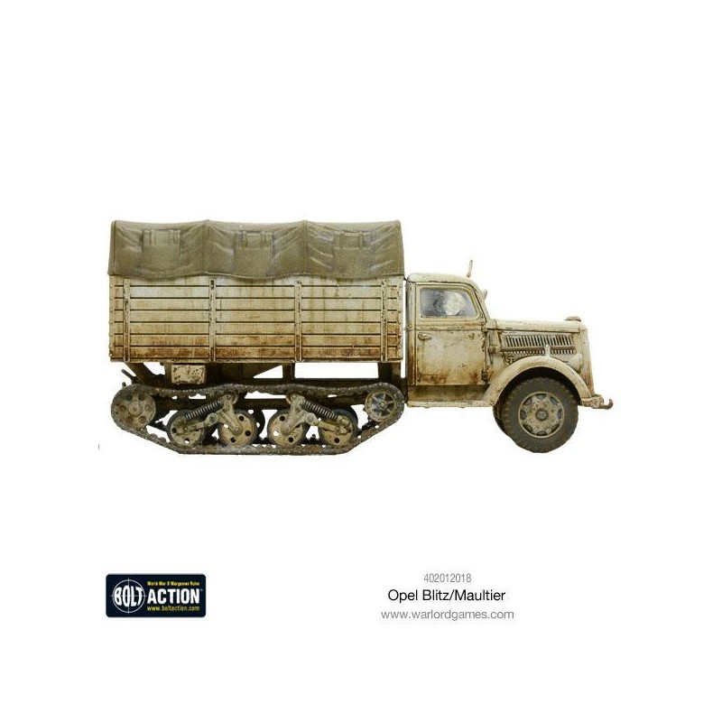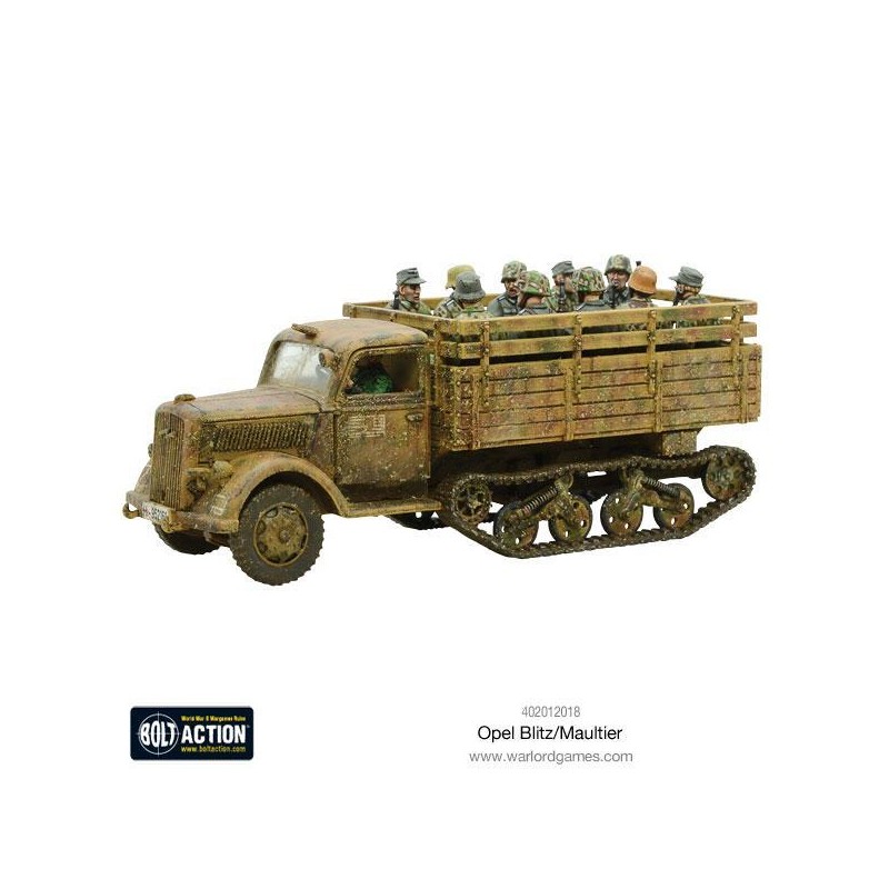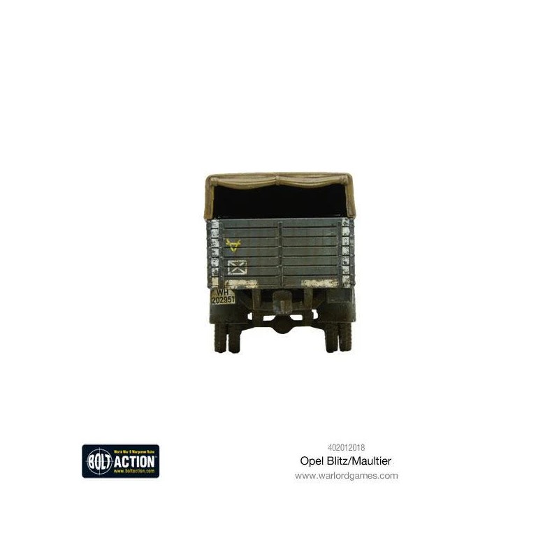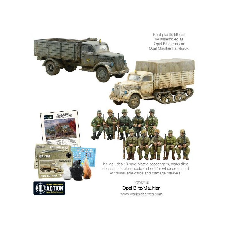Ce kit plastique finement détaillé permet de construire au choix un Opel Blitz ou un Maultier, avec différentes options d’apparence pour la bâche arrière. En plus d’un guide de montage en couleur, il inclut des fantassins assis, des marqueurs de fumée et de dégâts, ainsi que des cartes de jeu spécifiques. Un ajout incontournable pour tout commandant allemand soucieux de renforcer la mobilité et le réalisme de ses troupes sur le champ de bataille de Bolt Action.