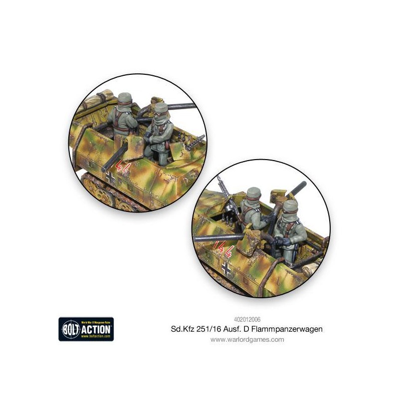 En plus de ses deux projecteurs principaux, le Sd.Kfz 251/16 était équipé d’une mitrailleuse MG34 ou MG42 montée à l’avant pour l’autodéfense, et d’un petit lance-flammes portable relié au véhicule, utilisable par l’infanterie débarquée. Ce dispositif permettait une plus grande flexibilité sur le champ de bataille, notamment lors d’assauts coordonnés. L’équipage portait des équipements de protection adaptés : cagoules, lunettes, écharpes épaisses… autant d’éléments parfaits pour inspirer des conversions originales et riches en caractère.