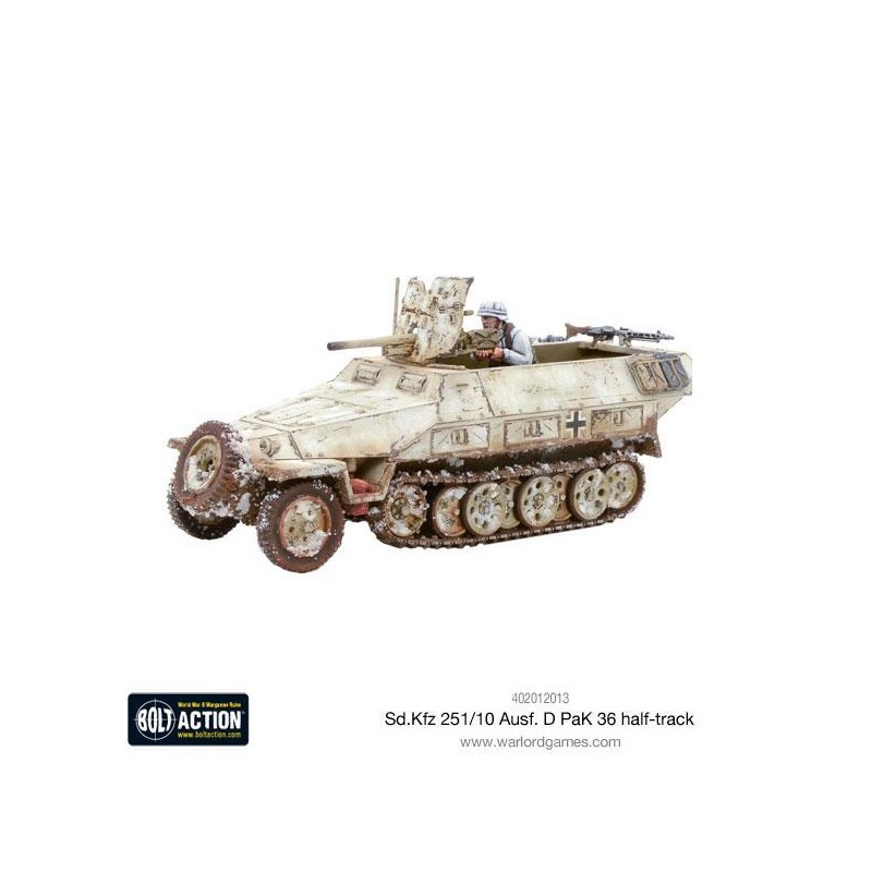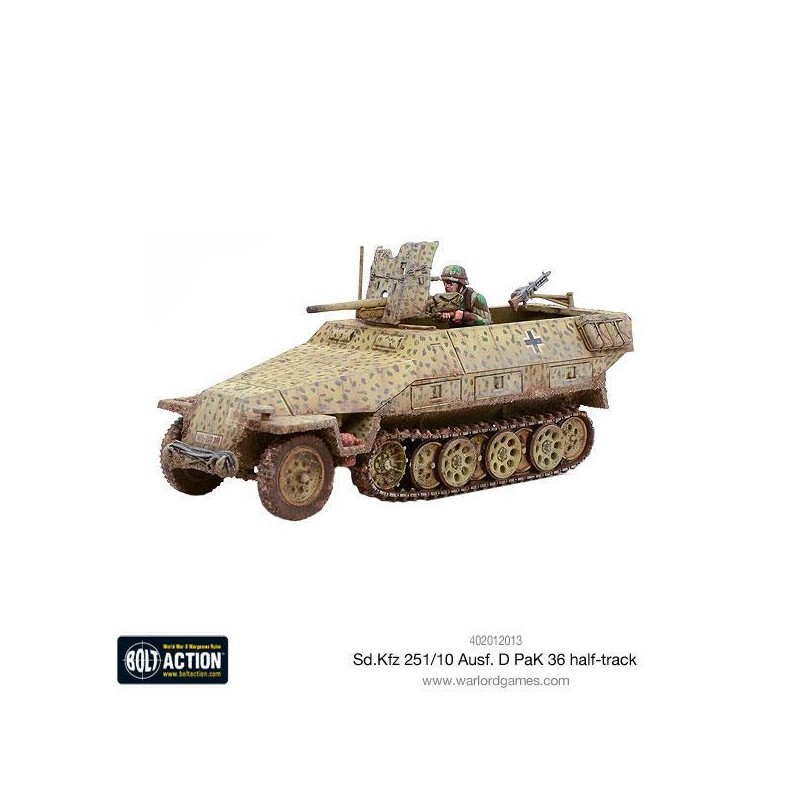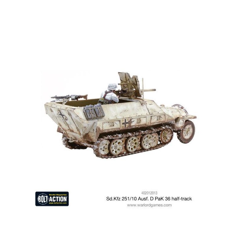 Bien que le PaK 36 ne fût pas la plus puissante des armes antichars — ses équipages lui avaient donné le surnom peu flatteur de « casse-porte » — il s’est révélé particulièrement efficace en appui-feu plutôt qu’en combat antichar direct. Plus de 300 demi-chenillés furent convertis en variantes Sd.Kfz 251/10, déployés sur les fronts russe, nord-africain et en Europe de l’Ouest. La version D se distingue par un blindage arrière simplifié en une seule plaque inclinée, tandis que la version de commandement conservait le modèle plus ancien, mais toujours efficace, du « casse-porte ».