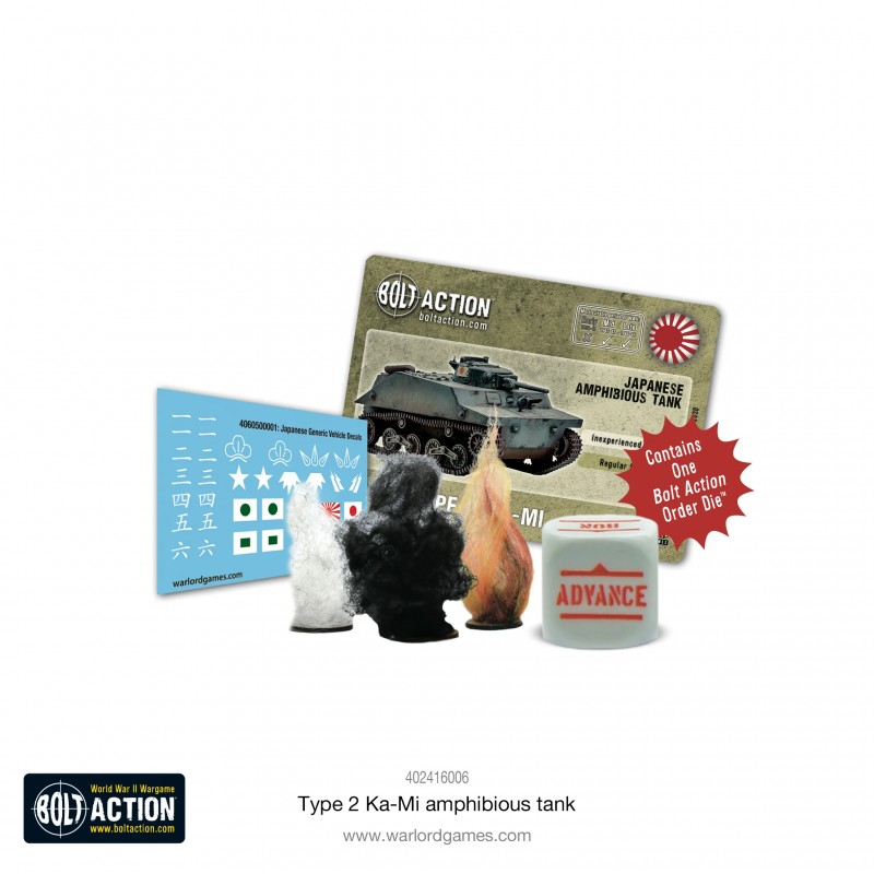 Le pack contient un char amphibie en résine et métal, une carte de stat de Bolt Action, des marqueurs de dégâts pour véhicules, des décalcomanies en couleurs pour les water-slide et un dé d'ordre de Bolt Action.