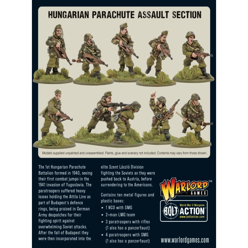 J'en profite !Le 1er Bataillon de Parachutistes hongrois a été formé en 1940, avec un transport assuré par la compagnie aérienne nationale, la Mágyar Légiforgalmi R.t. Ils ont fait leurs premiers pas au combat contre la Yougoslavie en 1941, où ils capturèrent le canal Franz Josef après quelques difficultés initiales. Cependant, ce n'est que le 19 décembre 1944, alors qu'ils faisaient partie de la prestigieuse division Szent László, qu'ils furent déployés en tant que troupes d'urgence pour colmater les brèches des anneaux de défense de Budapest. Bien que le régiment ait subi de lourdes pertes, il fut salué dans les rapports de l'Armée allemande pour son esprit de combat agressif face aux attaques soviétiques écrasantes.