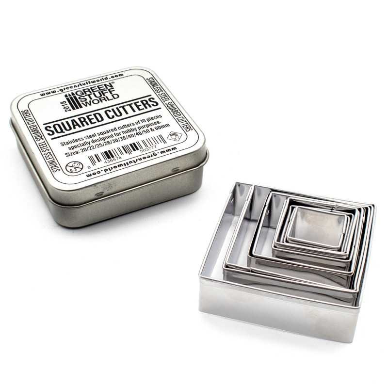 J'en profite !Lot de cutters carrés en acier inoxydable, disponibles dans les diamètres les plus courants, idéaux pour la création de bases et de remplissages. Ils permettent de découper rapidement l’argile et d’autres matériaux. Grâce à la variété des tailles proposées, ces cutters conviennent aussi bien aux bases de dimensions standard qu’aux bases à bords inclinés, réduites de 2 mm.