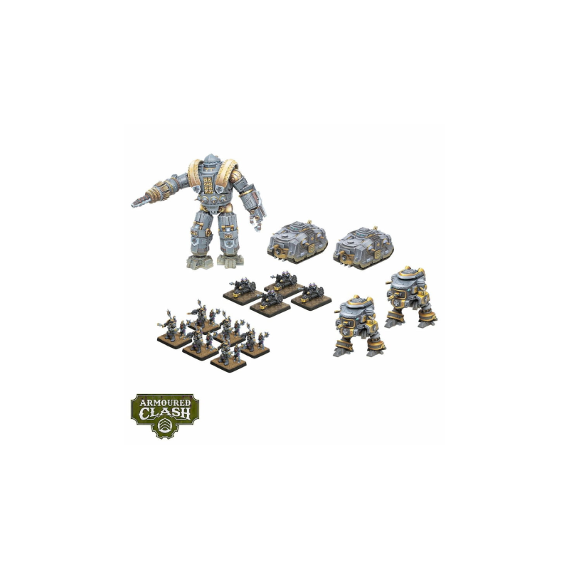 Aux côtés de ce géant de fer, les chars de combat Sturmpanzer avancent, capables d'affronter presque toutes les cibles grâce à leur armement varié. Les Marcheurs Lourds Lucifyr traquent les flancs et ratissent les forêts, utilisant leurs lance-flammes pour éliminer les ennemis à couvert. Les Castellans Armigers Teutoniques sont soutenus par leurs carrés d'automates et utilisent leur armure assistée et leur armement voltaïque pour défendre les lignes, tenant bon quoi qu'il en coûte. Les Dreirads Lourds Scion parcourent le champ de bataille à la recherche d'ennemis isolés et d'éclaireurs ennemis ; le cavalier et le mitrailleur de side-car opèrent de concert pour contrer toutes les menaces.