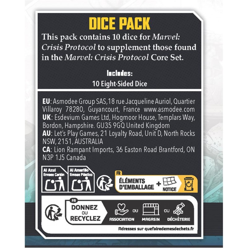 J'en profite !Complétez votre arsenal de jeu avec ce pack de 10 dés à huit faces spécialement conçus pour Marvel: Crisis Protocol. Que vous soyez un vétéran du jeu ou un nouveau venu, disposer de dés supplémentaires permet de fluidifier vos parties et de lancer des attaques puissantes sans interruption.