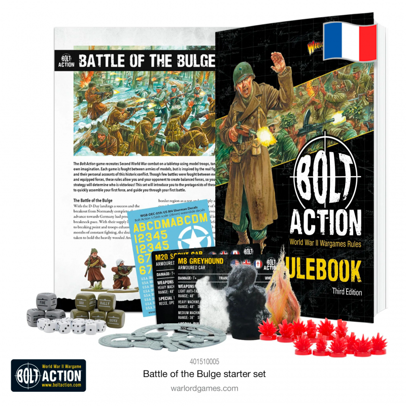 Les figurines américaines et allemandes peuvent être assemblées de multiples façons, permettant de créer divers types d’unités : escouades d’infanterie, équipes de mitrailleuses, officiers, observateurs, médecins, tireurs d’élite, et bien plus encore. En plus des troupes, ce coffret inclut un véhicule blindé américain M8 Greyhound, qui peut être monté en version M20, ainsi qu’une ferme en ruines en plastique pour enrichir vos champs de bataille. Le set de démarrage Battle of the Bulge vous fournit tout le nécessaire pour vous lancer dans Bolt Action : montez vos figurines, suivez les scénarios du livret inclus et commencez à jouer !
