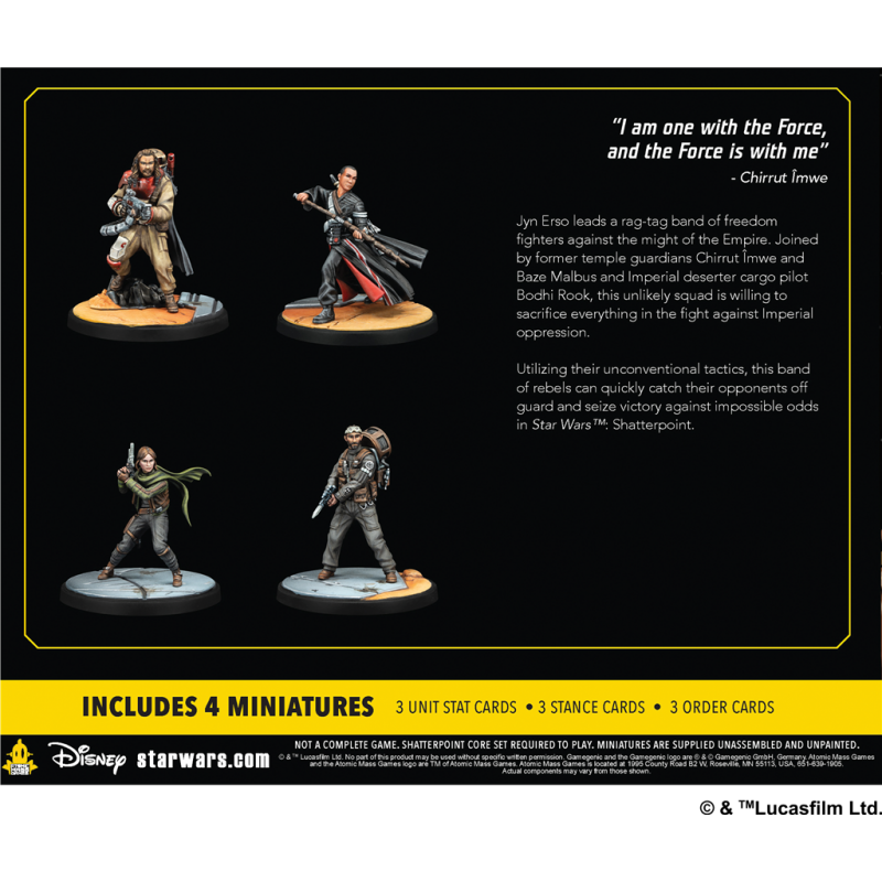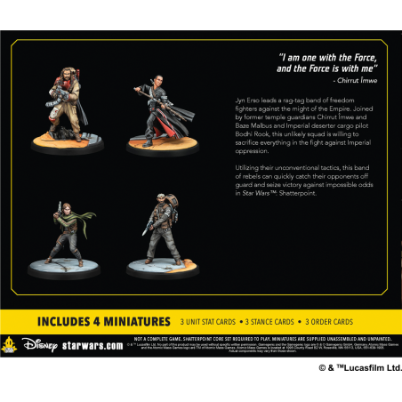 Ce set comprend quatre figurines détaillées à assembler et à peindre, accompagnées de toutes les cartes nécessaires pour les intégrer à vos escarmouches. La boîte de base Star Wars: Shatterpoint est requise pour utiliser ce produit. Renforcez la résistance et faites pencher la balance du conflit galactique en votre faveur.