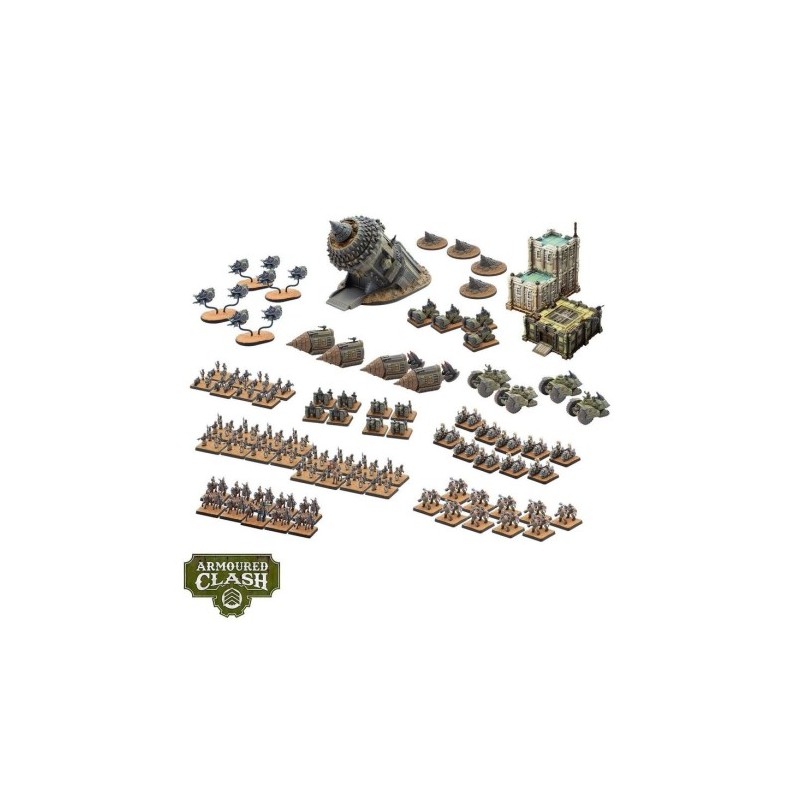 Plongez dans l’univers brutal d’Armoured Clash avec ce coffret de démarrage dédié à la faction du Commonwealth. Conçu pour les généraux en herbe comme pour les stratèges chevronnés, ce set complet vous permet d’entrer immédiatement dans le conflit. Vous y trouverez une armée prête à déployer, menée par le gigantesque Miron Super-Heavy Borer, capable de surgir du sol dans un grondement de roche, accompagné d’escouades disciplinées de fusiliers Ryadovoy, de motos à roues hussards ailés et d’unités de cavalerie des steppes expertes dans la destruction de blindés.