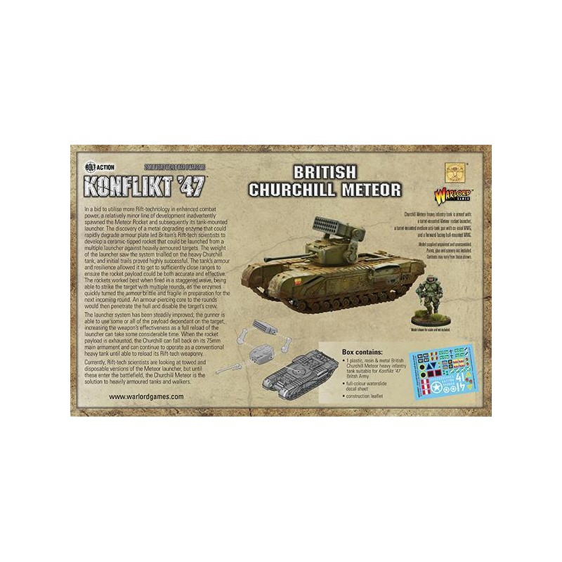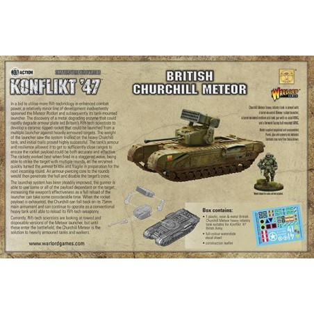 J'en profite !Dans le cadre de ses efforts pour maximiser l’usage de la technologie Rift sur le champ de bataille, un projet mineur a conduit à une avancée inattendue : la roquette Meteor, puis son système de lancement monté sur char. La découverte d'une enzyme dégradant rapidement les métaux a permis aux scientifiques britanniques de concevoir une ogive céramique capable de fragiliser les blindages ennemis avant d’être transpercés par un noyau perforant.