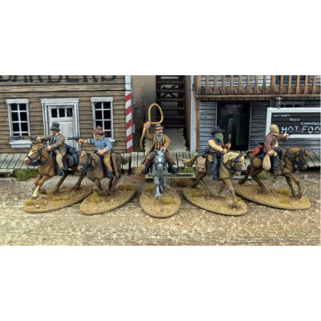 Le set monté est conçu pour pouvoir refléter les configurations du set de Gunfighters à pied, offrant ainsi une cohérence visuelle entre vos bandes à cheval et vos figurines au sol. Les chevaux et les figurines sont détaillés et modulables, permettant de varier les poses et d’adapter vos groupes selon les besoins de vos parties. Les bases ovales en plastique de 50 mm x 25 mm sont fournies pour stabiliser chaque duo cavalier-cheval sur le plateau de jeu et faciliter les déplacements pendant les affrontements.