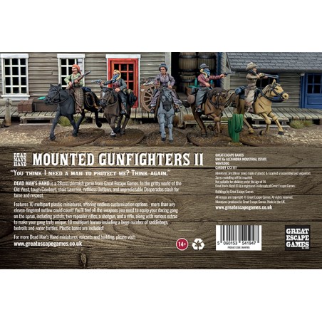 Des socles en plastique sont fournis pour stabiliser chaque cavalier et son cheval. Les figurines et les chevaux sont fournis non assemblés et nécessitent un peu de modélisme pour être montés et personnalisés. Ce set est idéal pour enrichir votre collection avec des bandes montées spectaculaires, apportant réalisme, dynamisme et immersion dans l’univers de Dead Man’s Hand, que ce soit pour des duels, des embuscades ou des chevauchées à travers la ville.