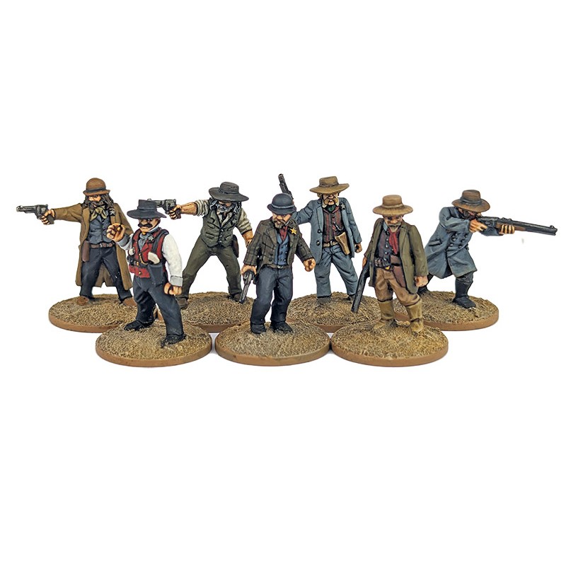 Les modèles sont fournis non peints et nécessitent un assemblage et un peu de modélisme, ce qui permet aux joueurs de personnaliser leur gang selon leurs préférences. Les figurines peuvent être combinées avec d’autres sets de la gamme Dead Man’s Hand, offrant une grande flexibilité pour créer des scénarios variés et immersifs. Les socles inclus assurent la stabilité des figurines sur le plateau de jeu et facilitent leur déplacement pendant les affrontements.