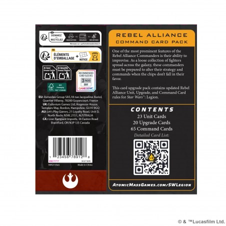 J'en profite !L'une des caractéristiques principales des commandants de l’Alliance Rebelle se trouve leur incroyable capacité d’improvisation. Face à un Empire organisé et implacable, les Rebelles ne disposent que de leur ingéniosité, de leur flexibilité et de leur volonté de s’adapter aux circonstances. Le Pack de Cartes de Commandement : Alliance Rebelle propose une mise à jour essentielle pour vos parties de Star Wars: Legion, en fournissant 108 cartes de règles révisées. Cet ensemble permet aux joueurs de mettre à jour leurs unités, améliorations et cartes de commandement rebelles selon le nouveau style visuel et les règles actualisées du jeu.