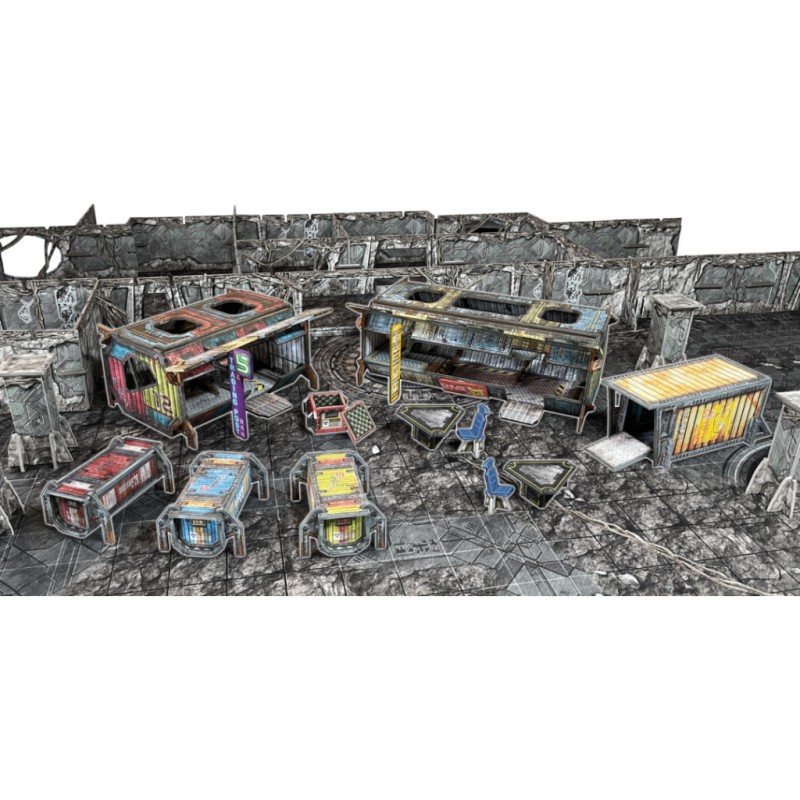 J'en profite !Trading Post 5 est une extension narrative qui enrichit vos parties de Space: First Born. Cette station de transit, installée à la hâte dans un cratère d’astéroïde abandonné, sert de lieu de ravitaillement et de rencontres interstellaires. Un capitaine entreprenant pourra y embaucher des commerçants, faire le plein de carburant et d’équipement et explorer un bazar éclectique de magasins, d’ateliers, de bars et d’antres d’iniquité.