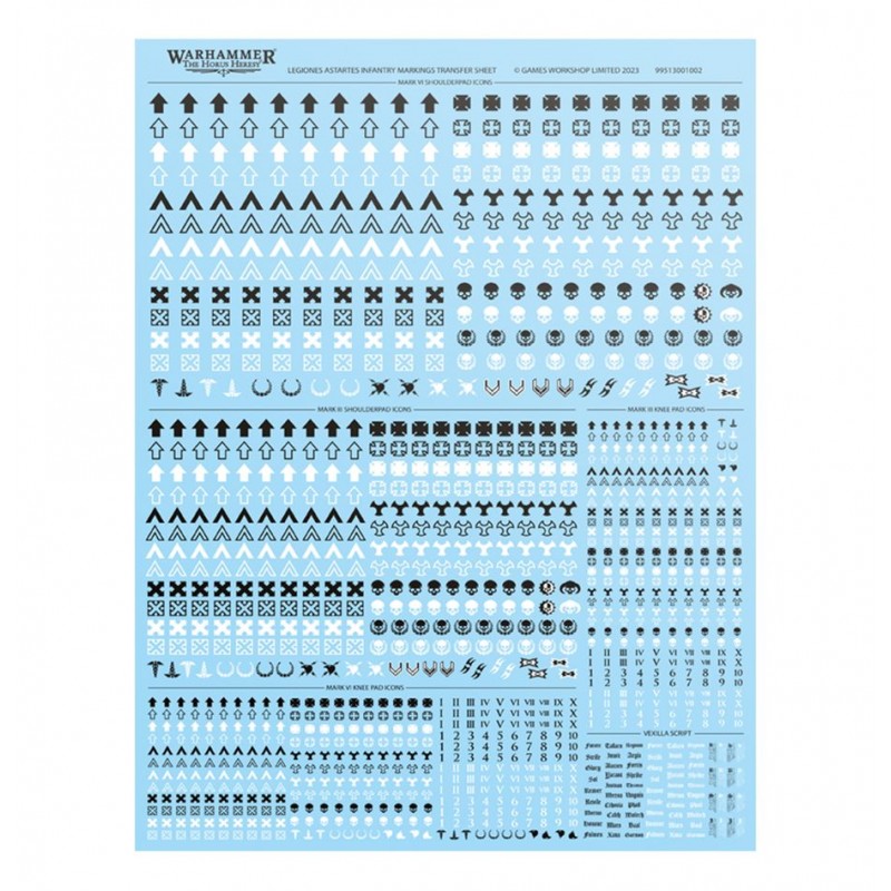 Avec un total impressionnant de 1280 décalcomanies de grande qualité, cette planche vous offre de quoi décorer une immense armée. Les motifs ne sont affiliés à aucune Légion particulière, ce qui vous permet de les utiliser indifféremment pour des forces Loyalistes ou Renégates. Faciles à appliquer et durables, ces marquages apportent un réalisme saisissant et permettent de différencier clairement vos unités, tout en donnant à votre collection une cohérence visuelle remarquable.