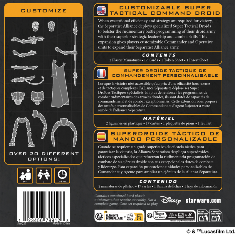 Cette extension pour Star Wars™: Legion offre aux joueurs deux unités de Commandant et d’Agent entièrement personnalisables pour enrichir leur armée de l’Alliance Séparatiste. Elle comprend plus de vingt pièces optionnelles permettant de modifier les poses, les équipements et les apparences des figurines, garantissant ainsi une grande liberté de création. Grâce aux treize cartes d’Amélioration incluses, chaque joueur peut adapter les capacités et le rôle de ses Droïdes Super Tactiques selon son style de jeu. Qu’il s’agisse de renforcer la ligne de front ou de diriger les opérations à distance, ces unités deviennent des éléments clés de toute stratégie séparatiste.