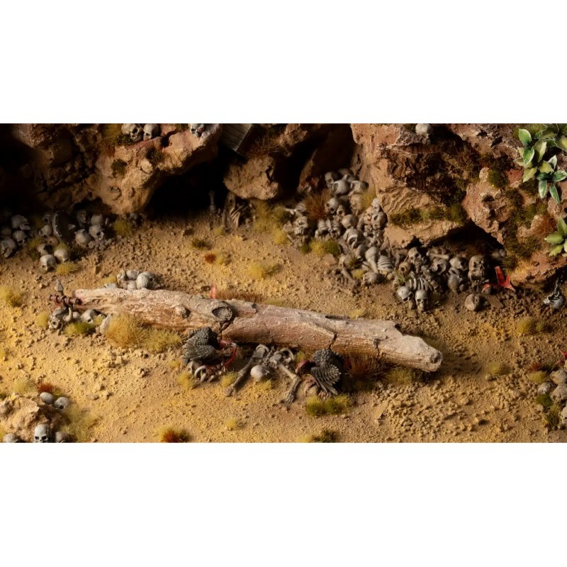 Là où les vautours rôdent sans fin, fouillant parmi d’innombrables corps éparpillés et décomposés, s’étend un champ de bataille avalé par le Temps. Ici, les crânes et les os de guerriers oubliés s’empilent, comme si une damnatio avait eu lieu. Des casques brisés s’accrochent encore à l’os et à la chair, tandis que les crânes tordus des orcs déchus murmurent les récits de créatures féroces tombées dans une guerre sans fin. C’est un lieu où les lignes du temps se brouillent, et où les histoires de tous ceux qui ont combattu – humains ou non – restent gravées dans la terre, à jamais liées dans la Mort et la Mémoire.