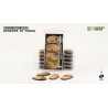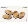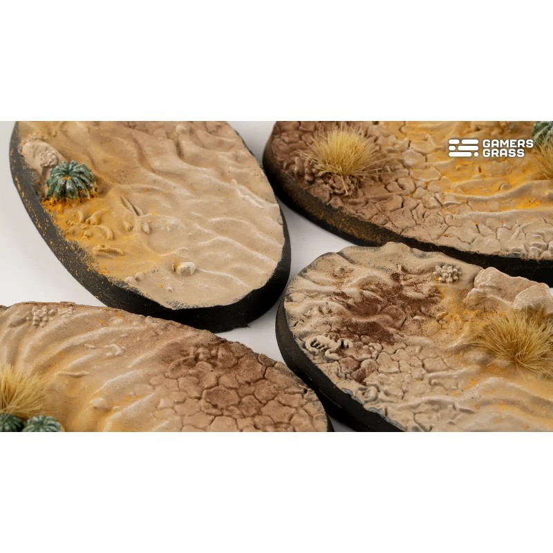 Ce blister contient 4 socles ovales Battle Ready en thermoplastique de 60 mm de large, sur le thème Deserts of Maahl.