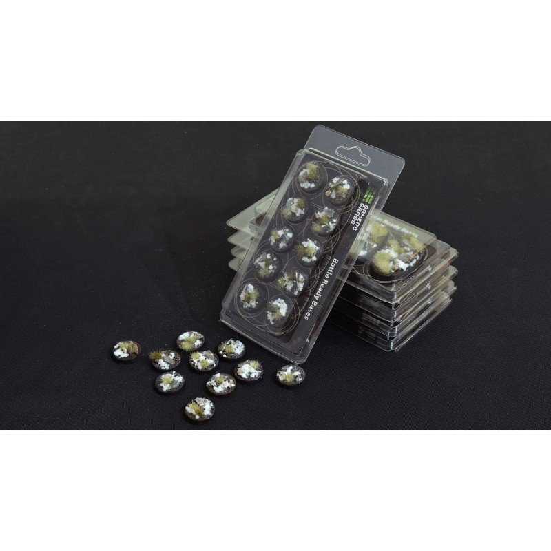 Ce pack contient 10 socles ronds Battle Ready de 25 mm de large, sur le thème Winter.