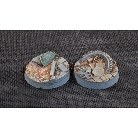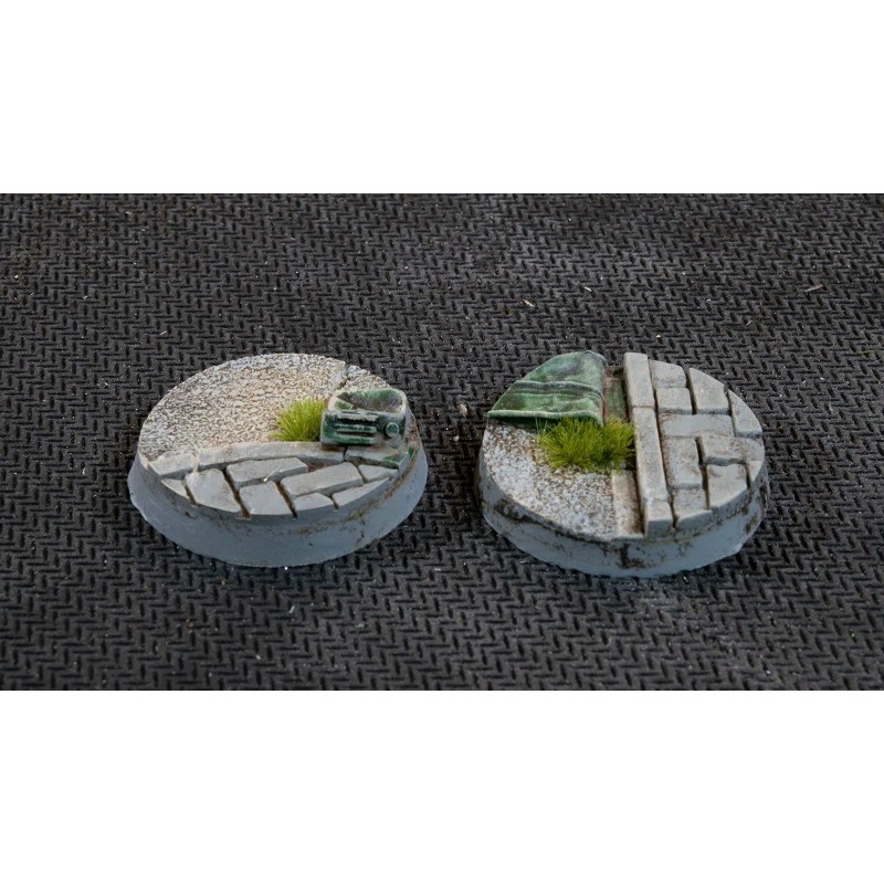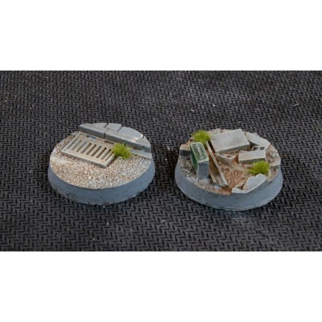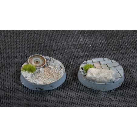 J'en profite !Ces socles représentent des rues poussiéreuses avec de l’asphalte cassé, des pavés de trottoir déplacés, des roues abandonnées, des sacs de sable, des tranchées, des bidons de carburant et divers débris partiellement recouverts de petites herbes et de mousses. Ils recréent fidèlement des environnements urbains en ruine, parfaits pour toutes vos scènes de guerre, qu’elles se situent dans les grandes guerres historiques ou dans des conflits futuristes de science-fiction.