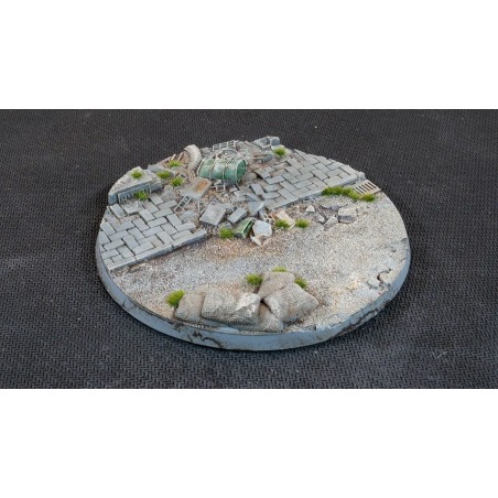 J'en profite !Ce socle représente une rue poussiéreuse avec de l’asphalte cassé, des pavés de trottoir déplacés, une roue abandonnée, des sacs de sable, des tranchées, des bidons de carburant et divers débris partiellement recouverts de petites herbes et de mousses. Il recrée fidèlement un environnement urbain en ruine, parfait pour toutes vos scènes de guerre, qu’elles se situent dans les grandes guerres historiques ou dans des conflits futuristes de science-fiction.