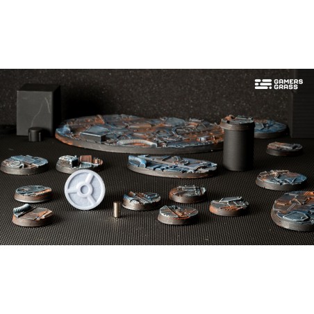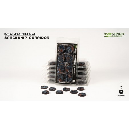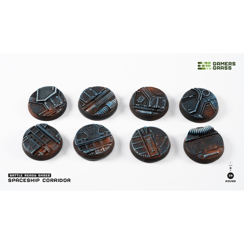 Ce blister contient 8 socles ronds Battle Ready de 28 mm de diamètre sur un thème couloir de vaisseau spatial. Chaque socle est fabriqué en thermoplastique durable et s’intègre facilement dans vos dioramas ou parties de jeu. Les rainures au bas des socles sont compatibles avec des aimants de 6 mm de diamètre et 1 mm d’épaisseur pour une fixation stable, bien que les aimants ne soient pas inclus.