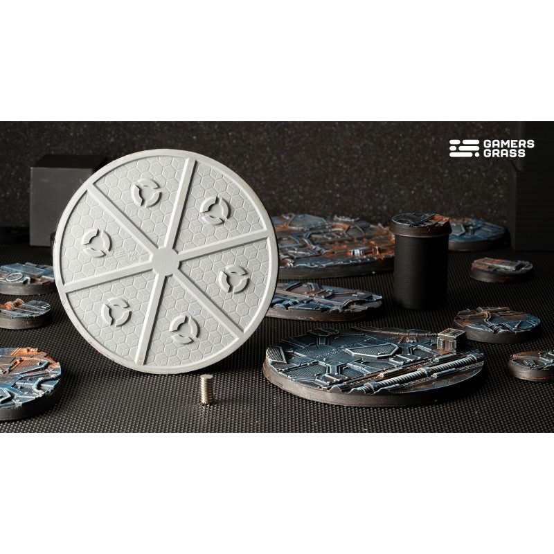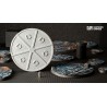 Ce pack contient 1 socle rond Battle Ready de 90 mm de diamètre sur un thème couloir de vaisseau spatial. Conçu en thermoplastique résistant, il s’intègre facilement dans vos dioramas ou vos parties de jeu. Les rainures situées sous le socle sont compatibles avec des aimants de 6 mm de diamètre et 1 mm d’épaisseur, garantissant une fixation solide. Les aimants ne sont pas inclus.