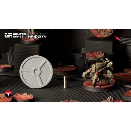 Ces socles ronds de 40 mm, conçus pour le jeu « Infinity » de Corvus Belli, présentent des marques Line of Fire (LoF) pour des parties tactiques et immersives. Les fentes situées sous chaque socle sont compatibles avec des aimants d’un diamètre maximal de 6 mm et d’une épaisseur de 1 mm, permettant une fixation stable sur vos plateaux de jeu ou systèmes de transport. Les aimants ne sont pas inclus.
