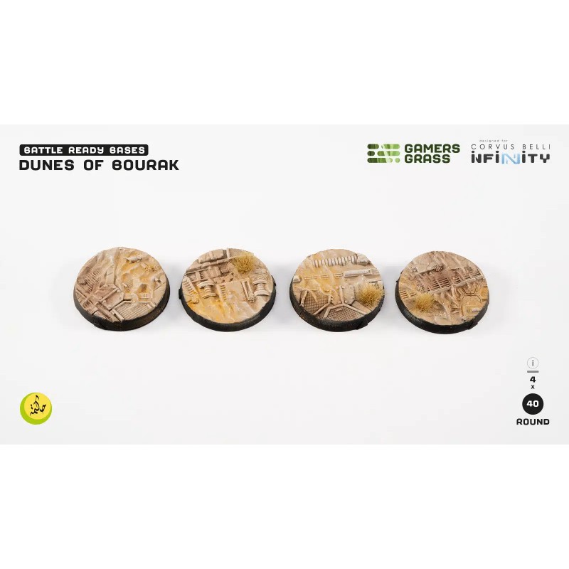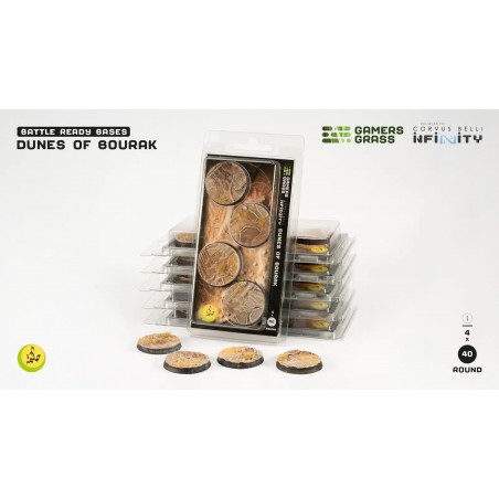 Ce pack contient 4 socles ronds Battle Ready peints et finis à la main. Chaque socle valorise les détails et les textures du thème Dunes of Bourak, offrant un rendu immersif et professionnel dès l’ouverture du blister. Ces bases renforcent l’atmosphère et la stratégie de vos parties « Infinity », idéales pour représenter les explorations et l’installation des Sālik sur ce monde chaud et exotique.