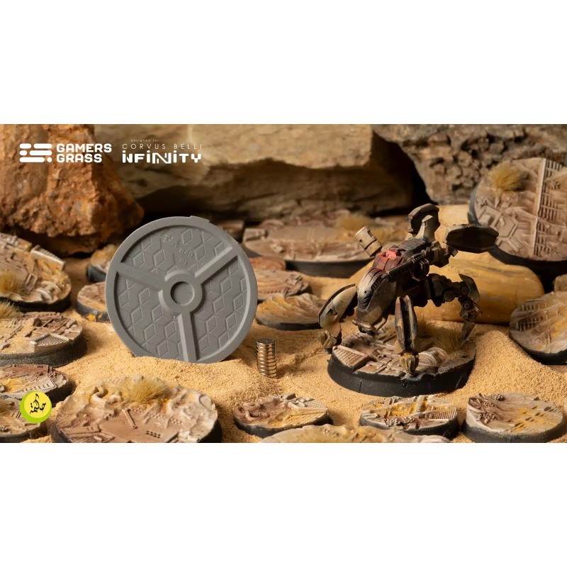 Ces socles ronds de 40 mm, conçus pour le jeu « Infinity » de Corvus Belli, présentent des marques Line of Fire (LoF) pour un gameplay tactique et immersif. Les fentes situées sous chaque socle sont compatibles avec des aimants d’un diamètre maximal de 6 mm et d’une épaisseur de 1 mm, permettant une fixation stable sur vos plateaux ou systèmes de transport. Les aimants ne sont pas inclus.