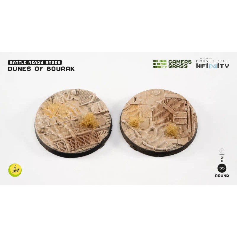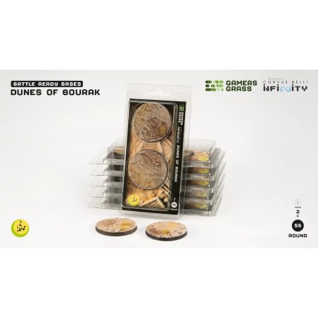 Ce pack contient 2 socles ronds Battle Ready peints et finis à la main. Chaque socle met en valeur les détails et textures du thème Dunes of Bourak, offrant un rendu immersif et professionnel dès l’ouverture du blister. Ces bases renforcent l’atmosphère et la stratégie de vos parties « Infinity », idéales pour représenter les explorations et installations des Sālik sur ce monde chaud et exotique.